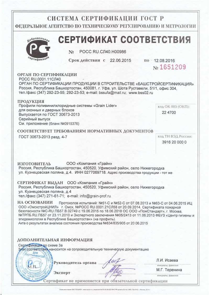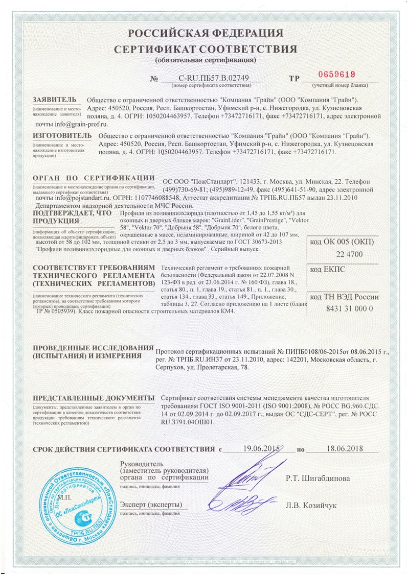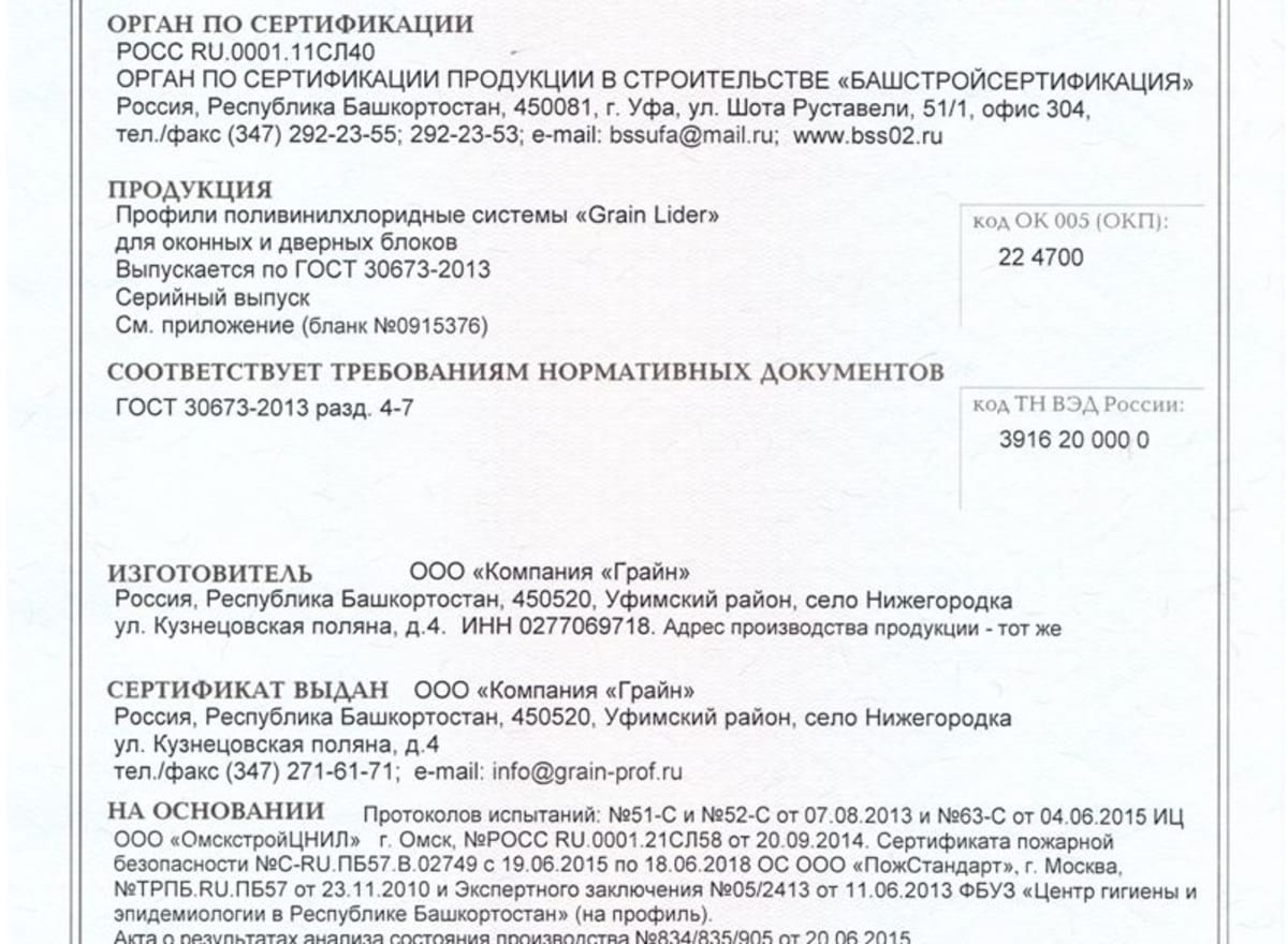 Все профильные системы компании «Грайн» подтвердили высокие физико-механические свойства, типа морозостойкости и сопротивления теплопередачи. На основании протоколов испытаний исследовательские центры выдали сертификаты соответствия ГОСТу 30673-2013, сертификаты соответствия требованиям пожарной безопасности и экспертное заключение на соответствие Единым санитарно-эпидимиологическим и гигиеническим требованиям к товарам.