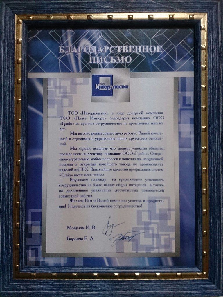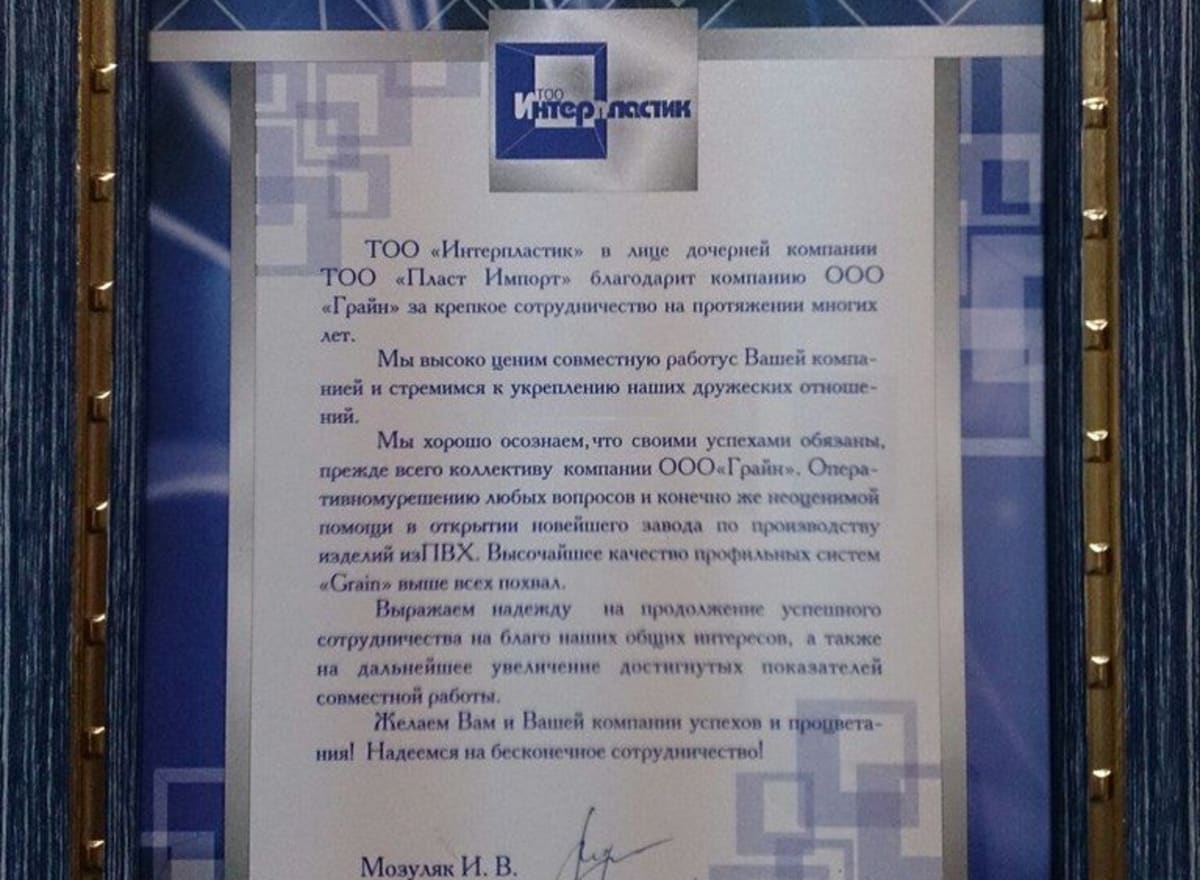 За время пребывания на заводе Grain партнеры из Казахстана посетила производство, встретились с топ-менеджментом компании «Грайн» и побывали на производственной базе партнера Grain в Уфе – компании «Галерея окон». Учредитель ТОО «Пласт Импорт» передал благодарственное письмо, в котором выразил признательность коллективу компании «Грайн» за сотрудничество, поддержку и высокое качество продукции.