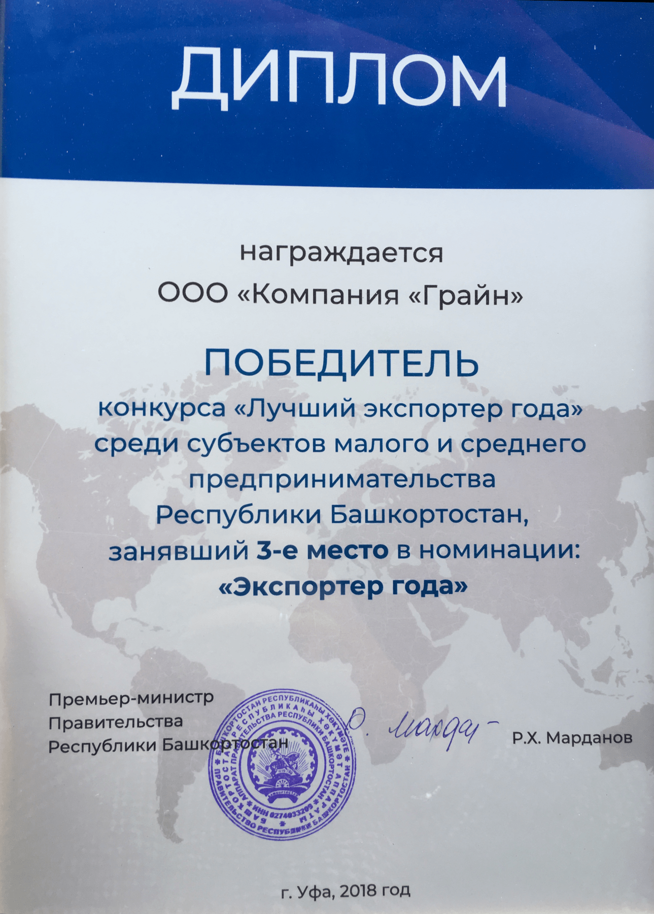 В рамках Международного форума «Время экспортировать» были названы лучшие экспортеры года в несырьевом неэнергетическом секторе региона. Награды «Лучший экспортер Республики Башкортостан» получили: Компания «Грайн», «Торговый дом «Фабрика сладостей», завод «Туймазытехуглерод». В сфере аграрно-промышленного комплекса лучшей стала компания «Экохимтех», а в сфере услуг — ООО «НИПИ ПЕГАЗ».