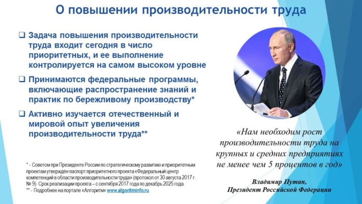 АНО «Федеральный центр компетенций в сфере производительности труда» создан 18.12.2017 по решению президиума Совета при Президенте РФ по стратегическому развитию и приоритетным проектам.